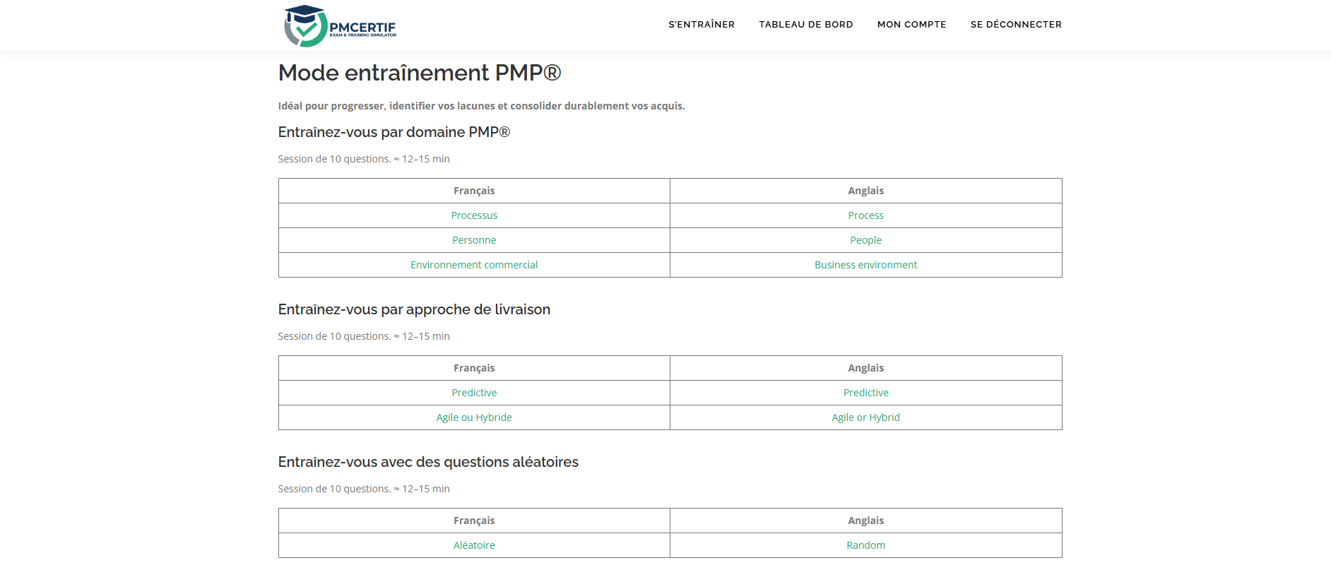 Entraînement PMP® ciblé par séries de 10 questions aléatoires selon :
